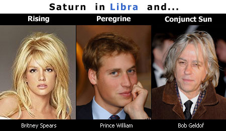 Saturn is very comfortable in Libra, the sign of its exaltation, and to some extent it embodies, via the polarity some of the youthful potential of Saturn in Aries. Britney then relates and appears as a Libra Saturn, while Prince William will be motivated to try and create a life purpose from it. This suggests incidentally a preoccupation with justice but most especially a great sense of duty and responsibility. Bob Geldof somewhat evinces this same quality, albeit self-consciously; his dedication to the Live Aid projects is testament to this exact principle, Saturn in Libra is greatly concerned with natural justice.